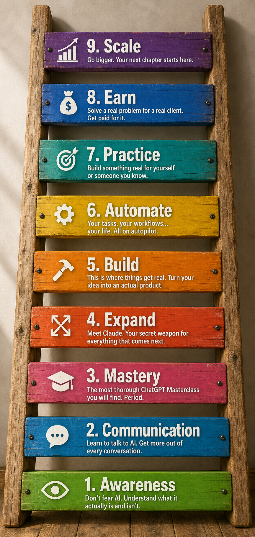 Master one tool properly and every tool that comes after gets easier. You learn to truly communicate with AI, which as you've seen, is one of the earliest and most important steps on the ladder.